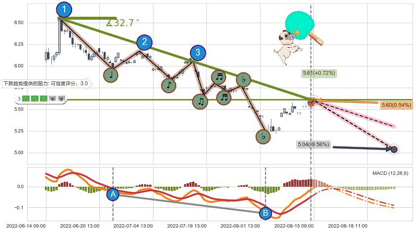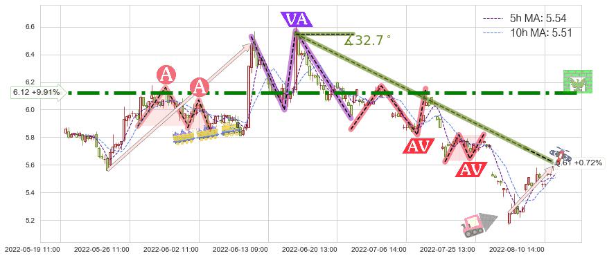 🦴 长线均值回复组合短线趋势跟踪[强阻力信号]2022-06-15 09:00-2022-08-05 13:00下跌趋势依然成立(下跌趋势跟踪依然存在),短线价格略微上行反弹(均值回复猜想),即将接近下跌趋势提供的未破位阻力价格:5.61。