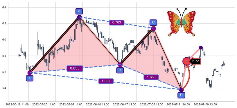 ➣ 谐波蝴蝶:c下跌到达d:猜想拉升 → 上涨 →【拐点】强支撑临近 → 大趋势均值回复