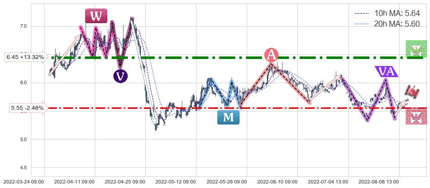 ♘ 支撑价格位5.55,可信任强度56.63%,距离最后交易2022-08-12 14:00形成的收盘价格5.69相差 -2.48%