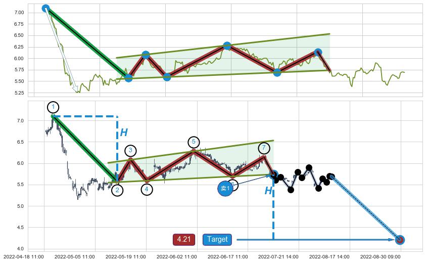 ➣ 收盘价(07-22:13: 5.69 )→回踩→第一根k线高点(07-20:14: 5.74 )