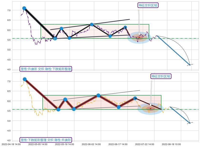 从2022-06-28 14:00至2022-08-04 13:00,共包含54个小时,阶段股价下跌-12.22%,阶段股价变动位移路程比: 1 : 3