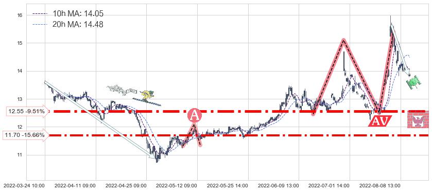 ♘ 支撑价格位12.55,可信任强度90.87%,距离最后交易2022-08-12 14:00形成的收盘价格13.87相差 -9.51%