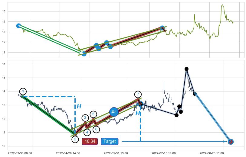 从2022-06-14 11:00至2022-08-01 14:00,共包含78个小时,阶段股价上涨23.97%,阶段股价变动位移路程比: 1 : 4
