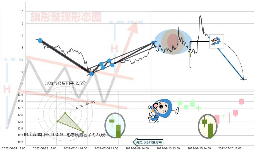 从2022-05-06 14:00至2022-08-11 14:00,共包含224个小时,阶段股价上涨23.58%,阶段股价变动位移路程比: 1 : 8,上涨趋势角度: 13.5,2022-07-29 13:00向⇪形成缺口,跳空上涨+10.04%