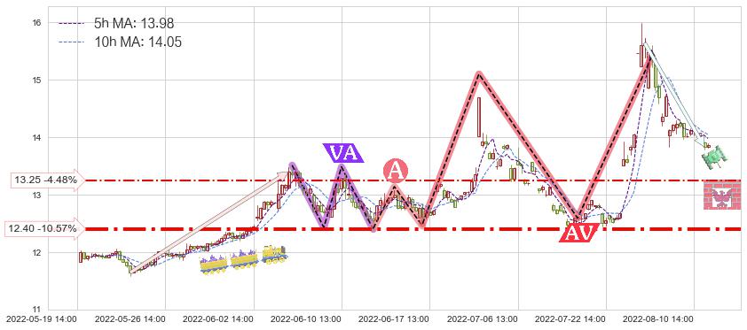 从2022-08-01 14:00至2022-08-12 14:00,共包含19个小时,阶段股价下跌-11.77%,阶段股价变动位移路程比: 1 : 1.8
