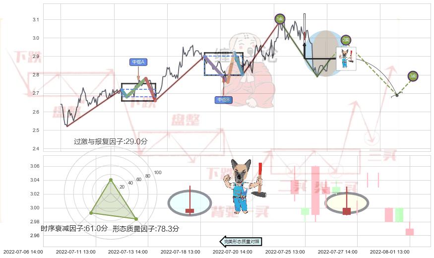 从2022-07-06 13:00至2022-08-04 13:00,共包含43个小时,阶段股价下跌-3.15%,阶段股价变动位移路程比: 1 : 13