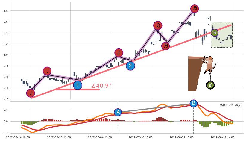 ✂️ 2022-06-14 11:00-2022-08-03 13:00上升趋势存在反转[风险],其原上升趋势的支撑位(8.54)已破位[强阻力信号],原上升趋势角度: 40.9˚