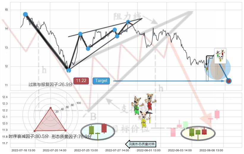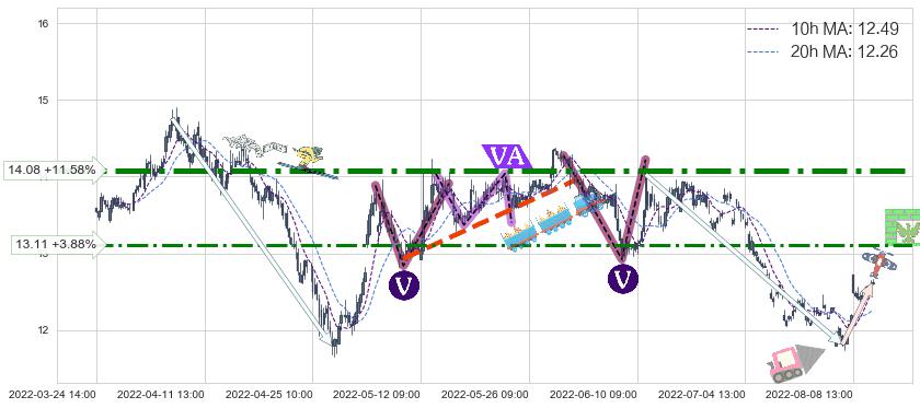 ♘ 阻力价格位14.08,可信任强度93.32%,距离最后交易2022-08-12 14:00形成的收盘价格12.62相差 +11.58%