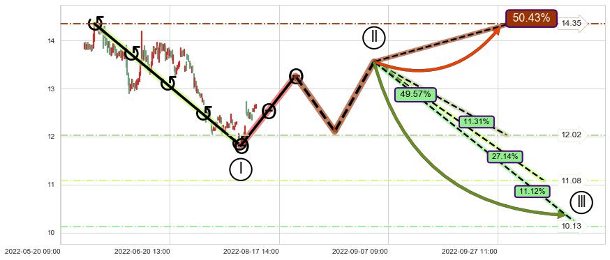 ♘ 阻力价格位14.02,可信任强度77.04%,距离最后交易2022-08-12 14:00形成的收盘价格12.62相差 +11.09%