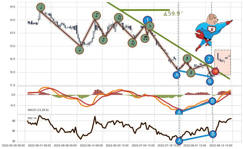 ➣ 2022-05-30 10:00-2022-08-12 13:00下跌趋势存在反转上涨[机会],其原下跌趋势的阻力位(11.74)已被突破[强支撑信号],原下跌趋势角度: 59.9˚