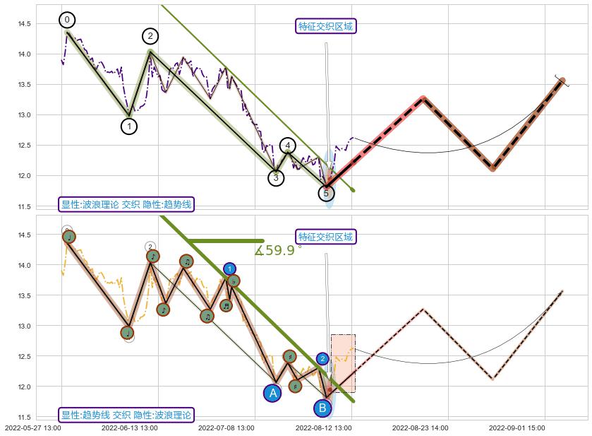 ➢ 最后的下跌趋势2022-05-30 10:00至2022-08-12 13:00:存在突破迹象,后续小反弹或者反转上涨