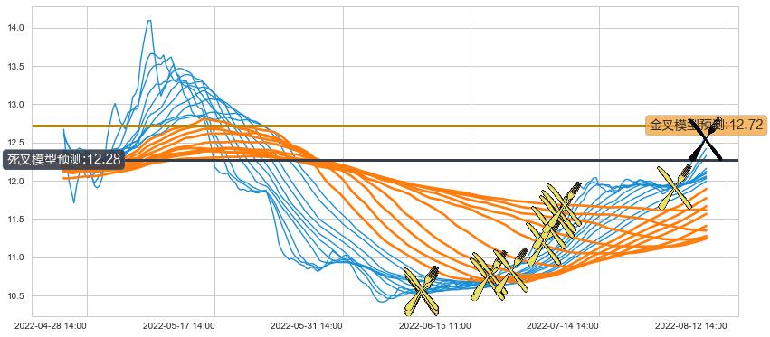 ➢ 5小时均线于(08-12 13:00: 12.54)形成【死叉】基于【死叉历史模型】预测死叉后最低波谷价格: 12.28, 死叉后最低价格12.54,已经下跌超出预测最低波谷价格, 预期反弹