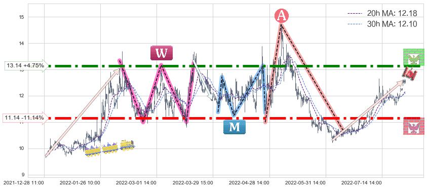 ♘ 支撑价格位11.14,可信任强度88.38%,距离最后交易2022-08-12 14:00形成的收盘价格12.54相差 -11.14%