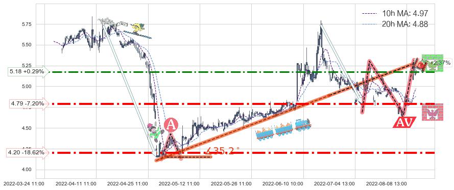 ➣ 2022-04-27 09:00-2022-06-17 09:00上升趋势存在反转[风险],虽然原上升趋势的支撑位(5.28)已破位,但其支撑效果尚存,原上升趋势角度: 35.2˚