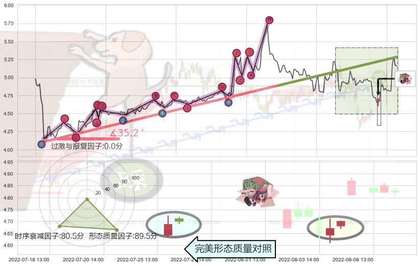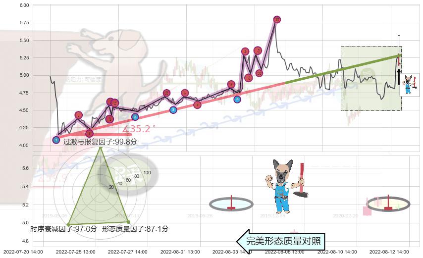 从2022-04-27 09:00至2022-06-17 09:00,共包含168个小时,阶段股价上涨23.25%,阶段股价变动位移路程比: 1 : 6,上涨趋势角度: 35.2