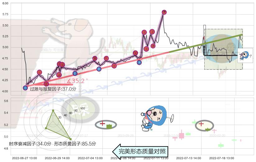 ➢ 2022-04-27 09:00-2022-06-17 09:00上升趋势存在反转[风险],虽然原上升趋势的支撑位(5.28)已破位,但其支撑效果尚存,原上升趋势角度: 35.2˚
