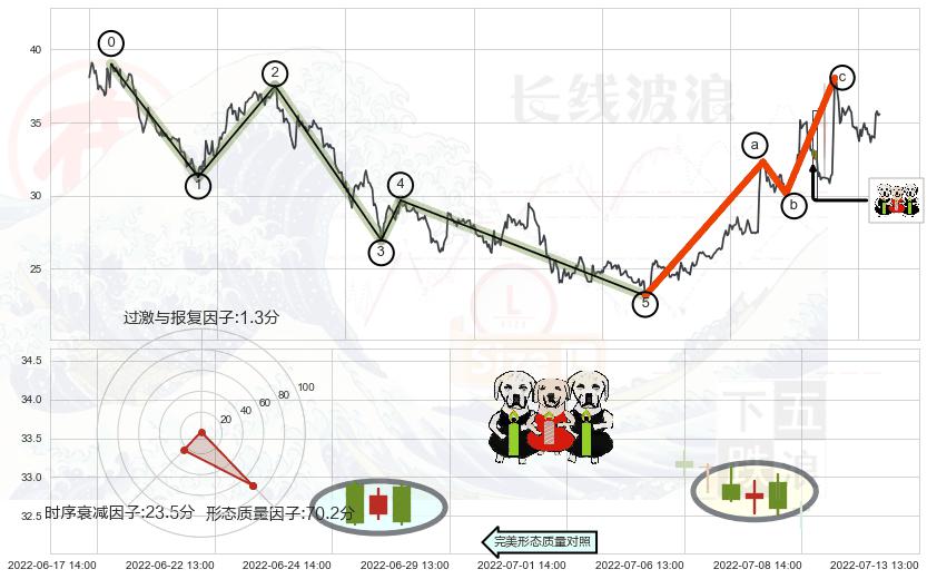 从2022-05-19 09:00至2022-07-20 14:00,共包含150个小时,阶段股价上涨52.75%,阶段股价变动位移路程比: 1 : 3,上涨趋势角度: 35.6,2022-07-19 13:00向⇪形成缺口,跳空上涨+10.01%