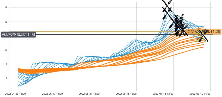 ➢ 13小时均线于(08-12 13:00: 11.01)形成【死叉】基于【死叉历史模型】预测死叉后最低波谷价格: 10.72, 死叉后最低价格11.02,已经下跌超出预测最低波谷价格, 预期反弹
