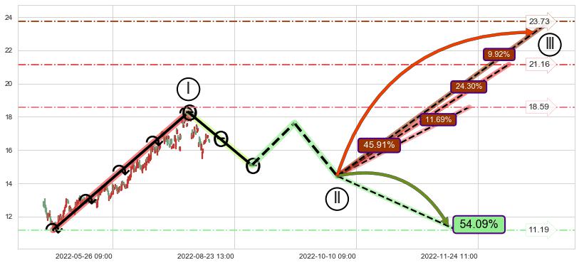 ➢ 循环浪继续向上【最高】位置(12-21:14, 23.73),匹配聚类样本比例21.61%, 可能性概率9.92%