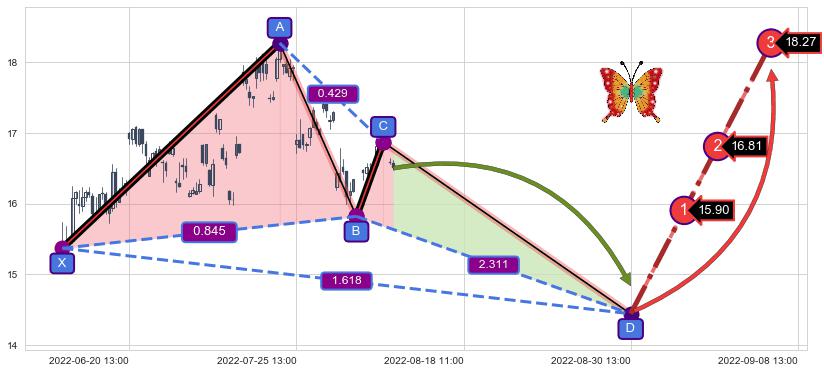 ➢ 距离预测D点位置有足够的下跌空间, 与看涨【蝴蝶】形态相反,实际方向【看跌】