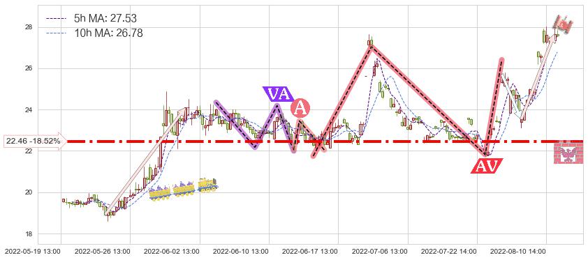 ♘ 支撑价格位22.46,可信任强度71.74%,距离最后交易2022-08-12 14:00形成的收盘价格27.57相差 -18.52%