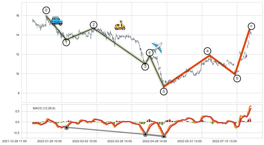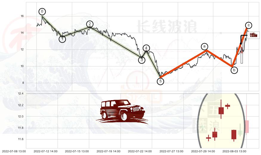 ➢ 波浪理论:猜想击穿突破c点后继续上涨 → 上涨 → 机会信号 → 小趋势跟踪