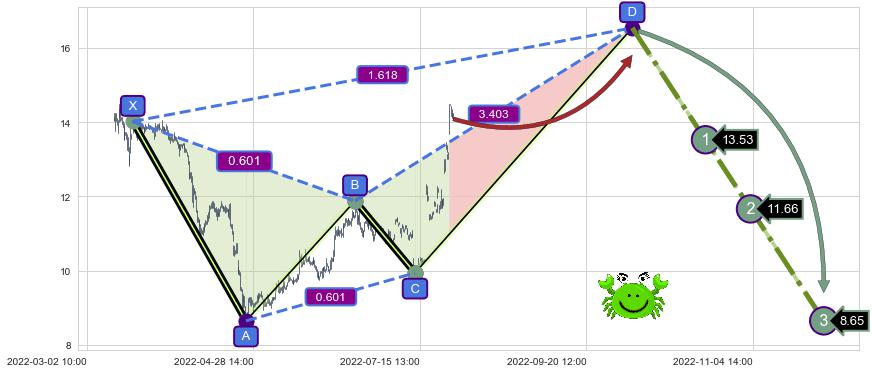 ➢ 距离预测D点位置尚有上涨空间,短线依然【看涨】, 耐心等待看跌【螃蟹】形态反转启动