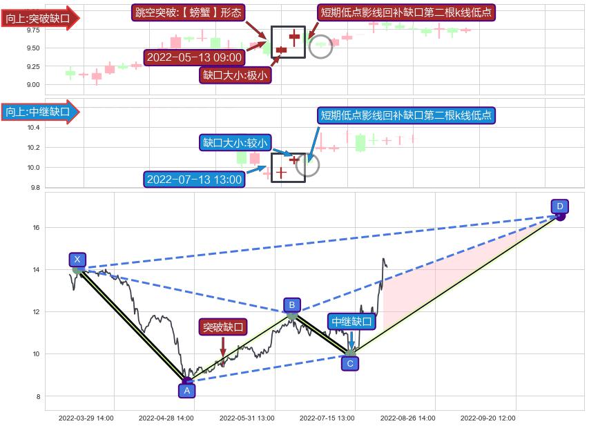 ➣ 突破缺口形成后,后续k已经超过14根,跳空突破【螃蟹】形态关键点后, 出现【轻微回踩】迹象,短期低点影线回补缺口第二根k线低点
