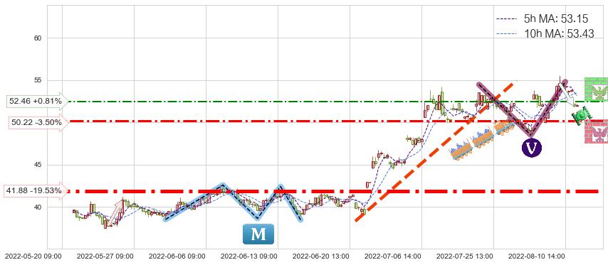 ♘ 阻力价格位52.46,可信任强度52.95%,距离最后交易2022-08-12 14:00形成的收盘价格52.04相差 +0.81%