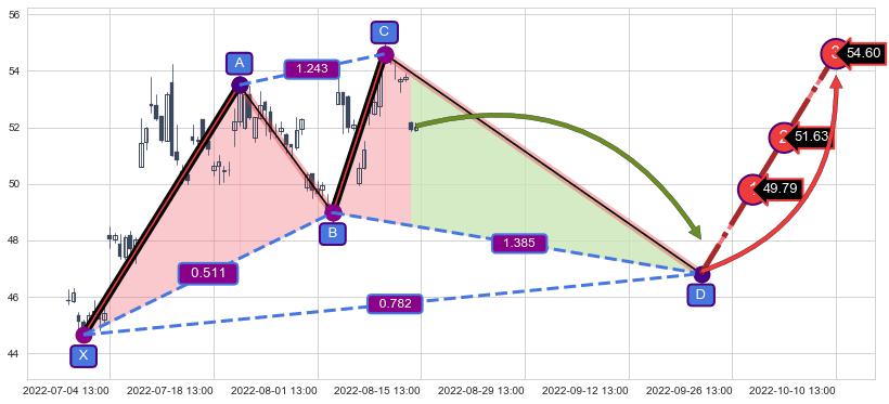 ➣ D点拟合预测价格46.82,距离最后交易收盘价格52.04相差 -10.03%