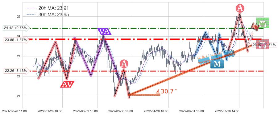 ♞ 20小时均线:23.91,30小时均线:23.95→ 快线<慢线
