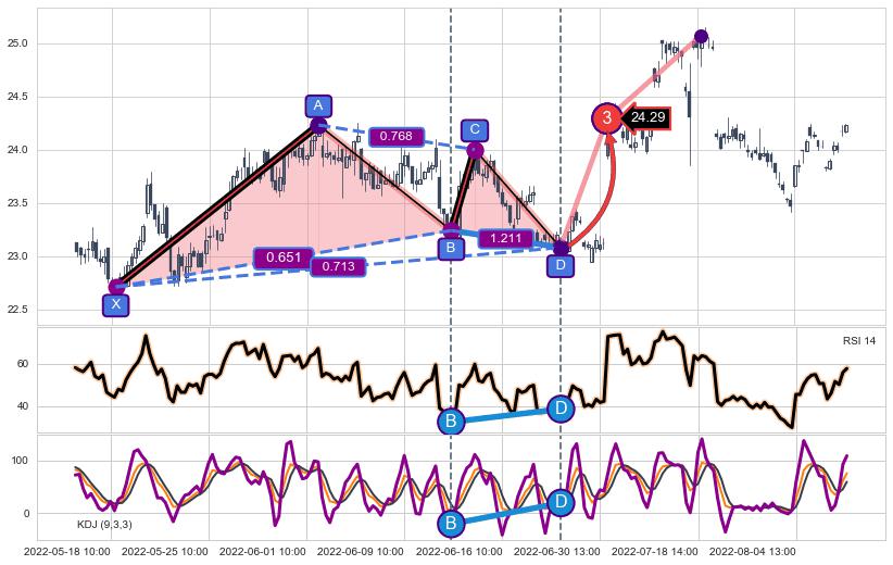➢ 谐波价格D点比B点低 ⤵,【KDJ】指标D点比B点高 ⤴️