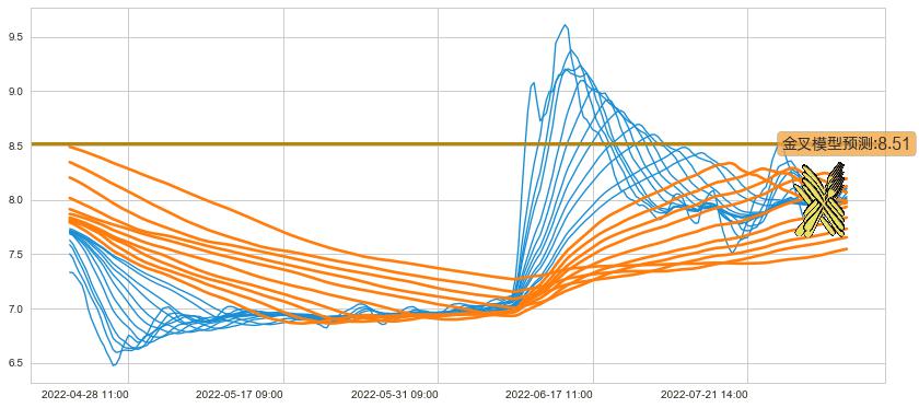 ➣ 70小时均线于(08-08 14:00: 7.96)形成【金叉】基于【金叉历史模型】预测金叉后最高波峰价格: 8.60, 金叉后最高价格8.26,尚未达到预测最高波峰价格, 预期继续上涨