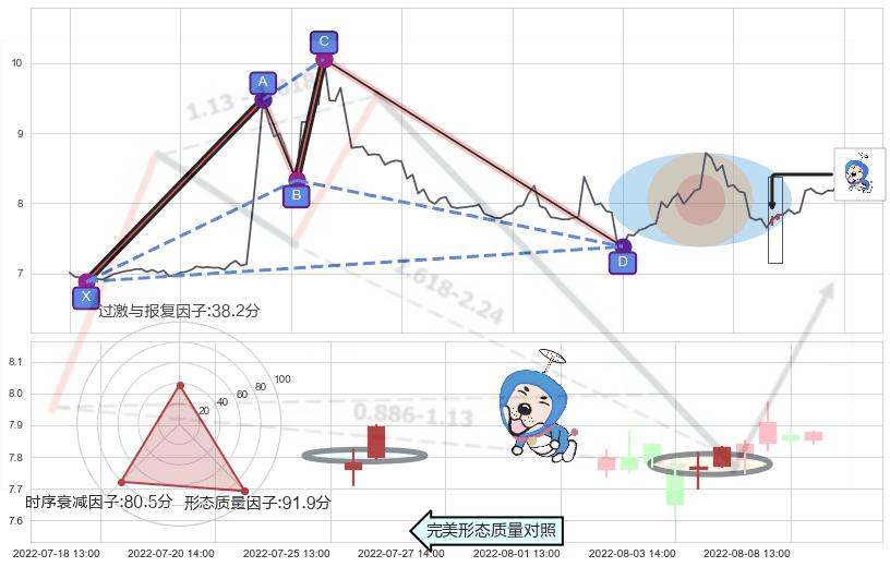 ➣ 上涨螺旋桨形态 + 谐波鲨鱼d拐点上涨支撑信号叠加后【目标达成率】中等,【看多】信号叠加【存续影响中等】