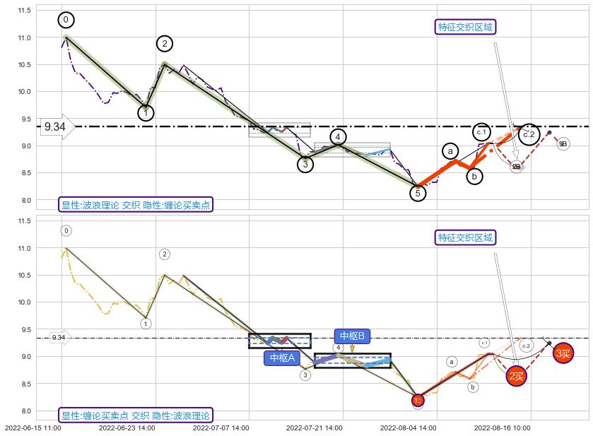 ➣ 缠论中枢点:猜想破位中枢B后持续下拉 → 下跌 → 破位中枢B支撑 → 持续趋势跟踪