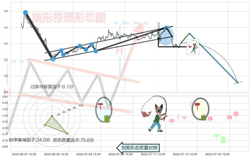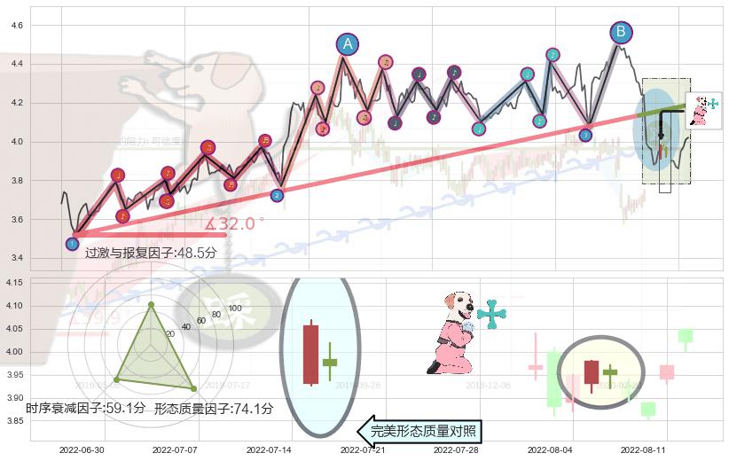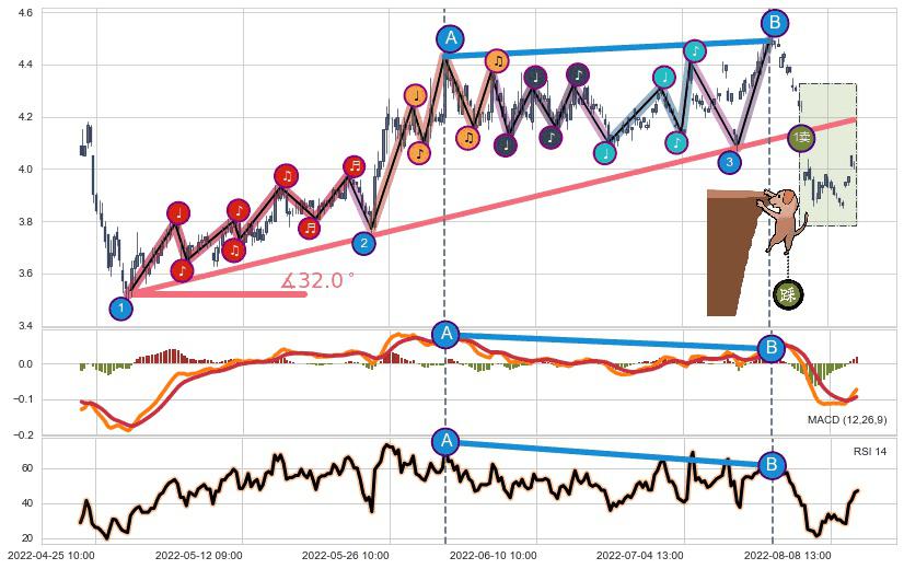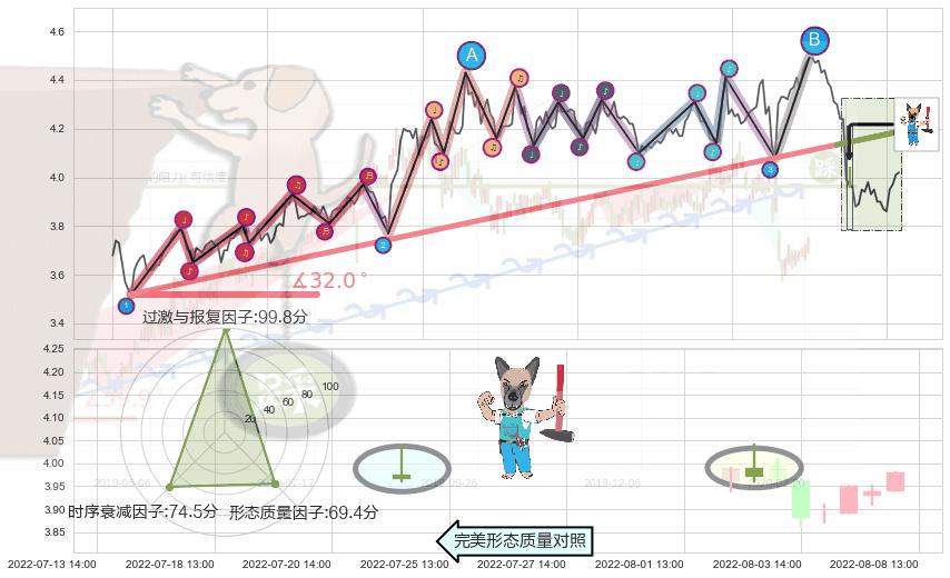 ➣ 2022-04-27 11:00-2022-07-29 14:00上升趋势存在反转[风险],其原上升趋势的支撑位(4.19)已破位[强阻力信号],原上升趋势角度: 32.0˚