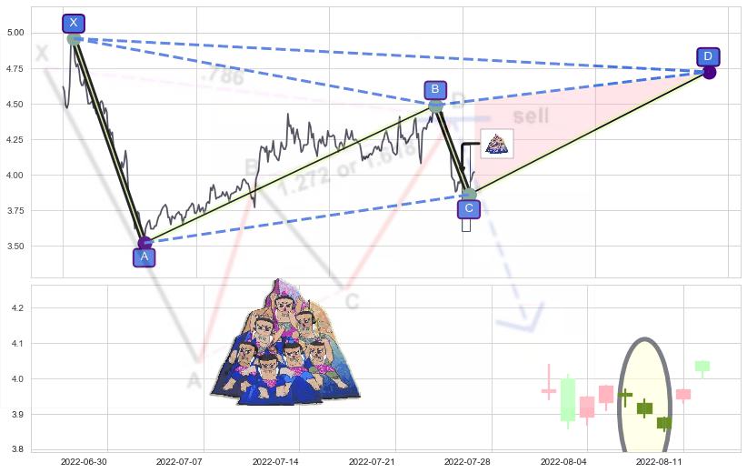 ➢ 谐波伽利:b下跌接近c:猜想支撑性拉升 → 上涨 →【拐点】支撑临近 → 大趋势均值回复