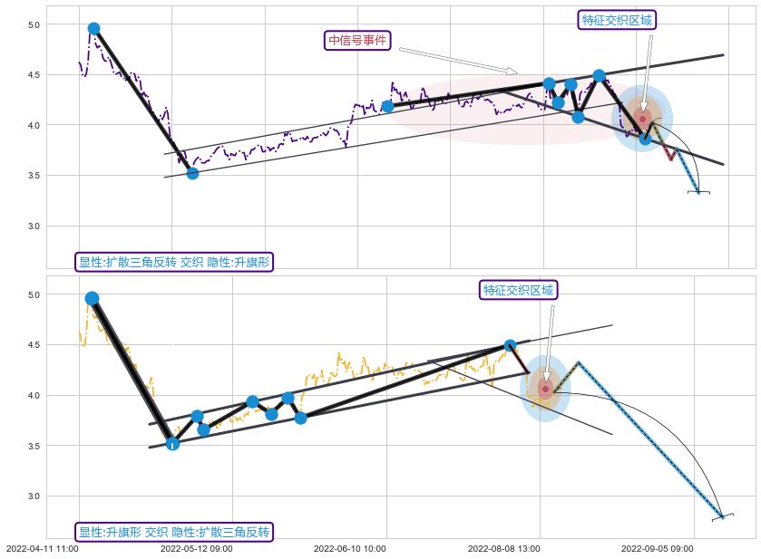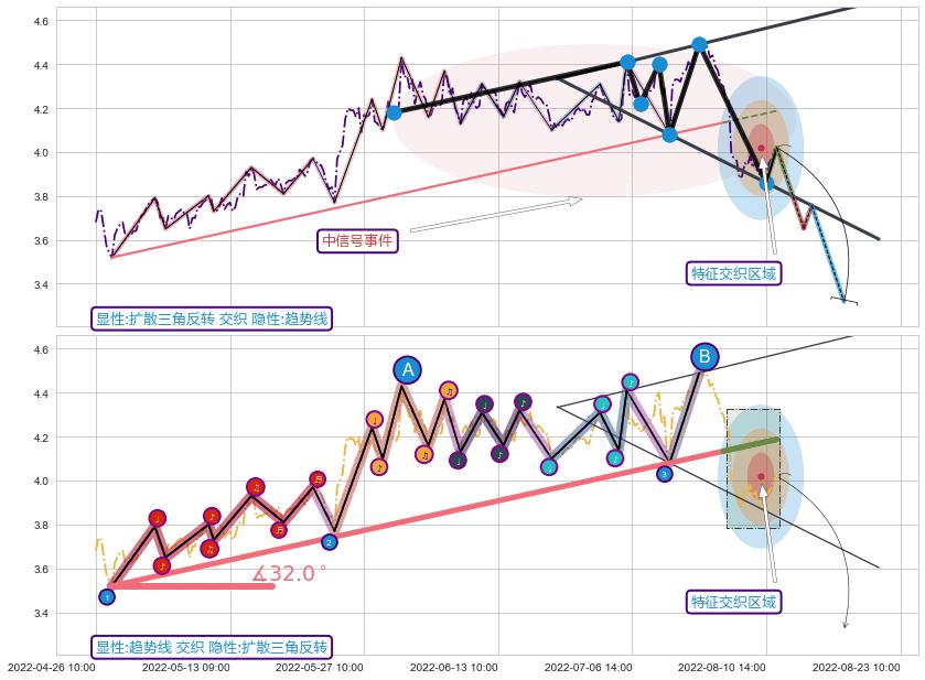 ➢ 2022-04-27 11:00-2022-07-29 14:00上升趋势存在反转[风险],其原上升趋势的支撑位(4.19)已破位[强阻力信号],原上升趋势角度: 32.0˚