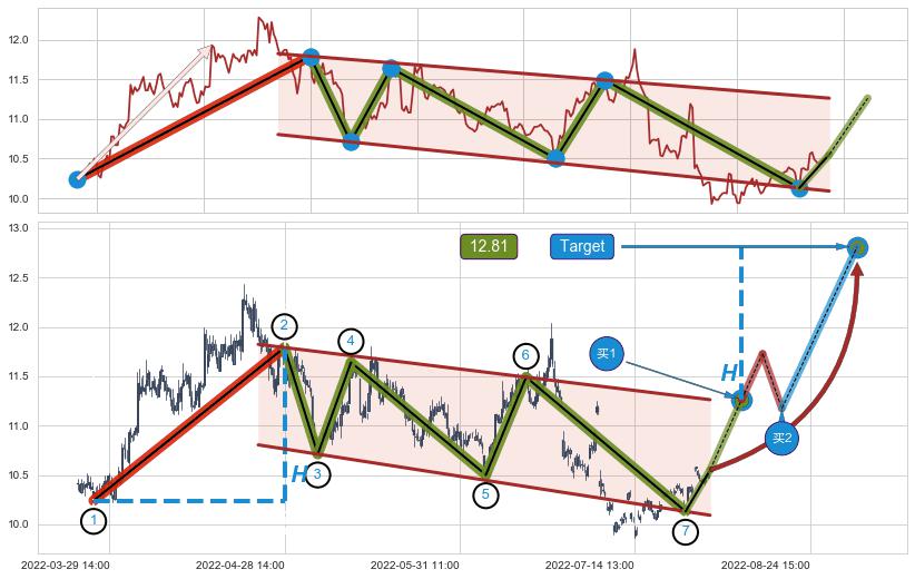 从2022-07-06 13:00至2022-08-03 14:00,共包含42个小时,阶段股价上涨2.12%,阶段股价变动位移路程比: 1 : 10