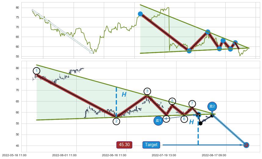 从2022-06-28 14:00至2022-08-12 13:00,共包含66个小时,阶段股价下跌-13.22%,阶段股价变动位移路程比: 1 : 6,下跌趋势角度: 32.1