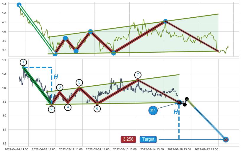 ➣ 最小中继整理跌幅→𝐇: 0.5300 (𝐇旗杆的长度:旗杆起点→顶点)