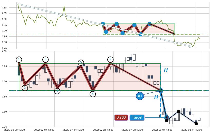 ➢ 【多方力量耗尽】已在08-02:13突破矩形提供的【支撑】颈线 3.870 →箱形震荡盘整结束