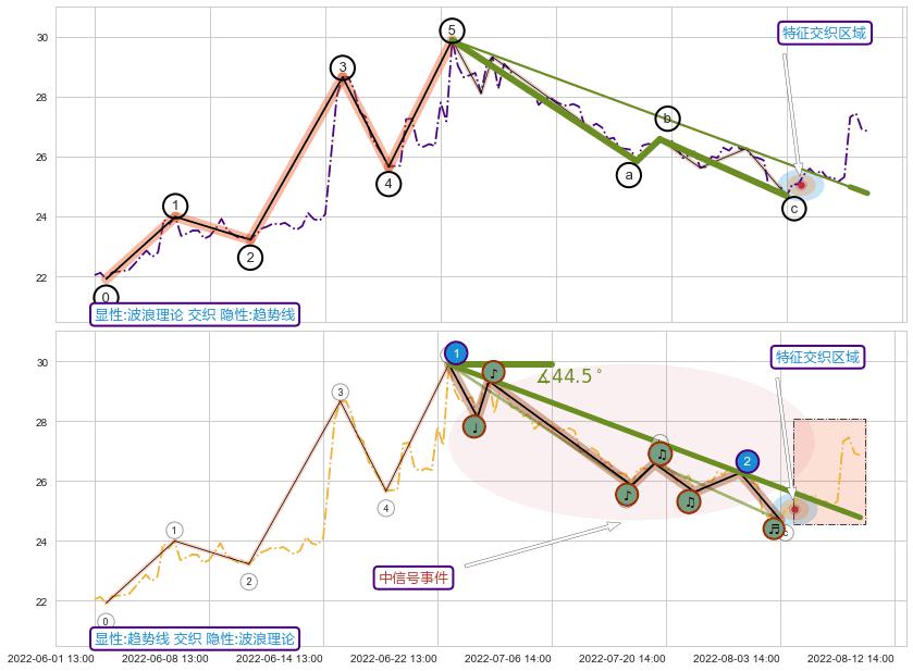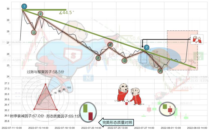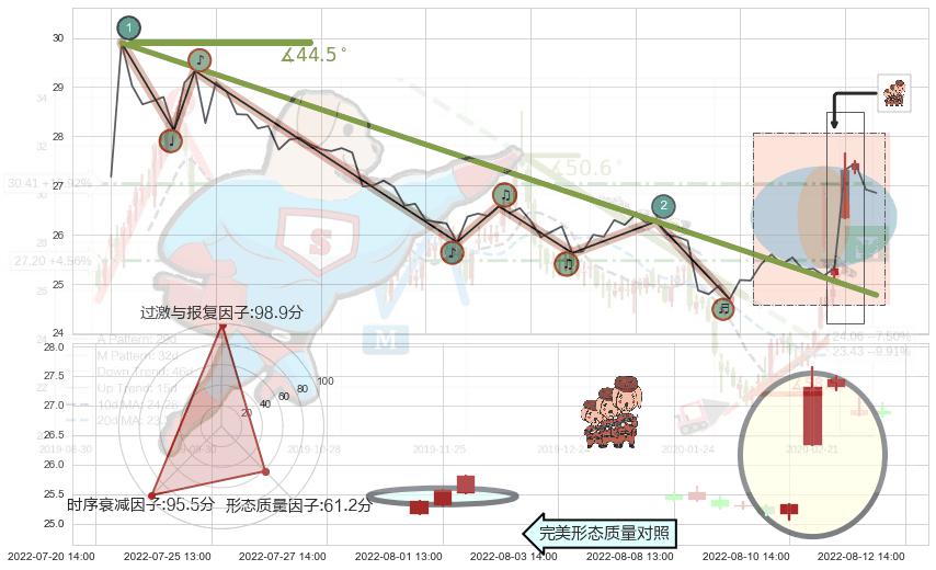 从2022-06-23 13:00至2022-08-11 13:00,共包含70个小时,阶段股价下跌-8.16%,阶段股价变动位移路程比: 1 : 8,下跌趋势角度: 44.5