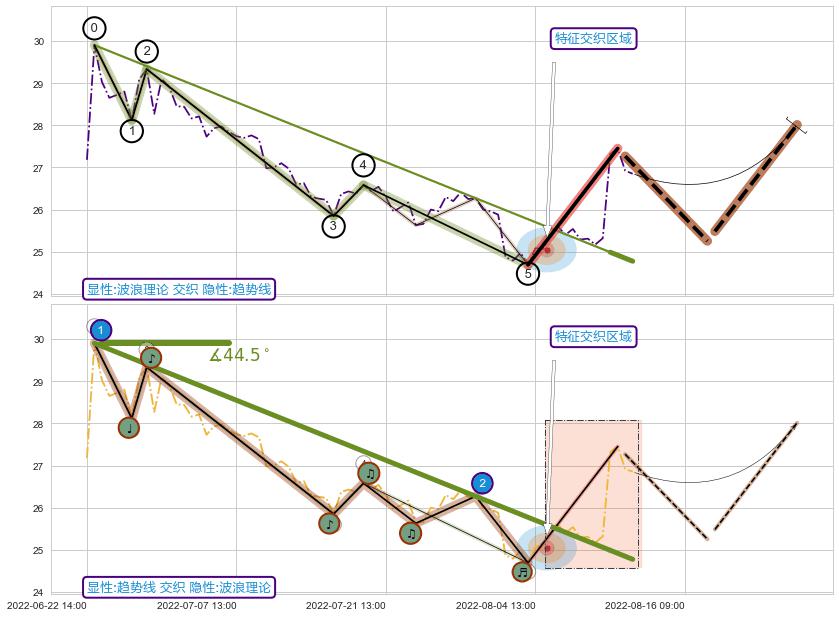 ➢ 2022-06-23 13:00-2022-08-11 13:00下跌趋势存在反转上涨[机会],其原下跌趋势的阻力位(24.78)已被突破[强支撑信号],原下跌趋势角度: 44.5˚