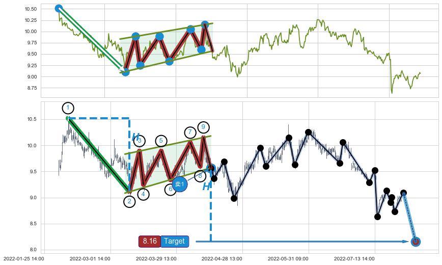 ➣ 升旗形:猜想预期下跌目标target即将达成,随后猜想强支撑来临,预期反弹上涨(均值回复)