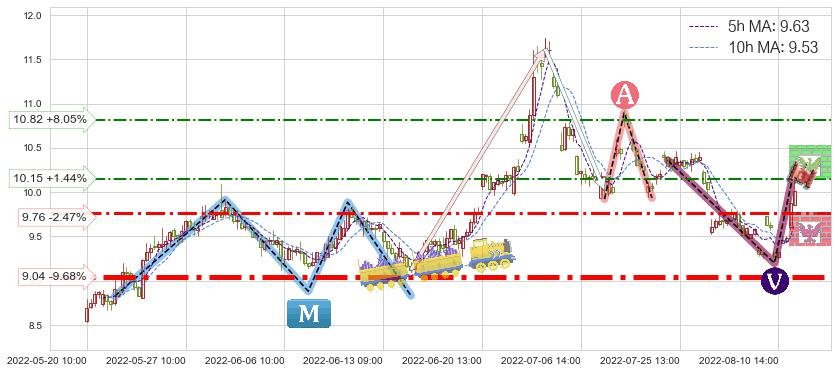 ♘ 阻力价格位10.82,可信任强度51.65%,距离最后交易2022-08-12 14:00形成的收盘价格10.01相差 +8.05%