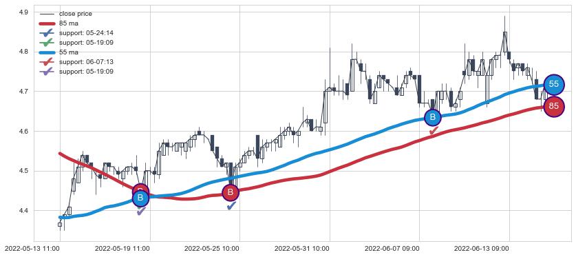 ➢ 85小时均线于(06-21 14:00: 4.71)形成【死叉】基于【死叉历史模型】预测死叉后最低波谷价格: 4.44, 死叉后最低价格4.35,已经下跌超出预测最低波谷价格, 预期反弹