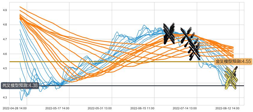 ➣ 40小时均线于(06-21 14:00: 4.76)形成【死叉】基于【死叉历史模型】预测死叉后最低波谷价格: 4.56, 死叉后最低价格4.35,已经下跌超出预测最低波谷价格, 预期反弹
