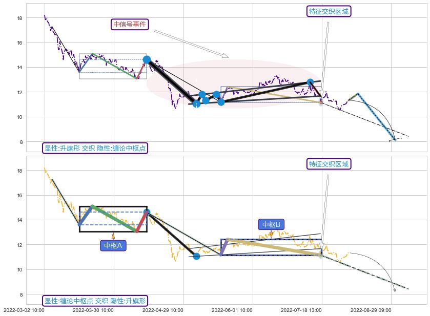➣ 缠论中枢点:猜想破位中枢B后持续下拉 → 下跌 → 破位中枢B支撑 → 持续趋势跟踪