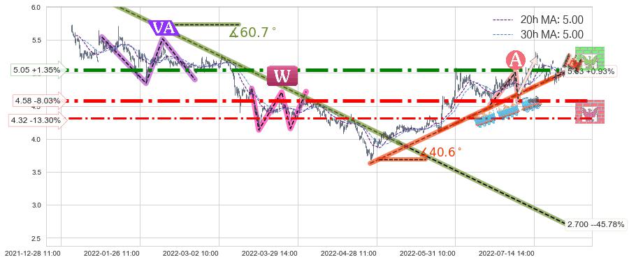 ♘ 支撑价格位4.58,可信任强度89.93%,距离最后交易2022-08-12 14:00形成的收盘价格4.98相差 -8.03%
